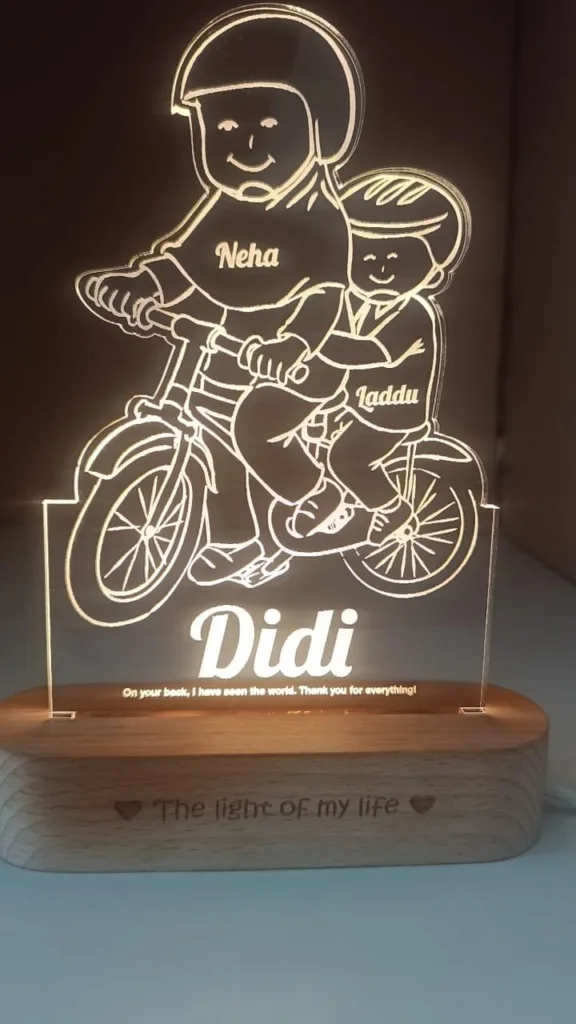 Crafted with precision and care, this 8-inch tall, 6-inch wide, and 2-inch deep lamp emits a warm glow that enhances its artistic appeal. It serves as a meaningful and cool gift for occasions like birthdays, Rakshabandhan, or simply as a token of gratitude for an older sister who has shaped your life in profound ways.
