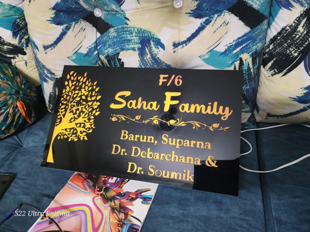A name plate which exemplifies the value of family is this design. Home is where everyone is. This acrylic name plate depicts a tree full of leaves on one side. On right is a nest, with a family of birds. The designer name plate displays the love for one’s family. There is ample space for the name of house and members within. Material used is black acrylic with a golden texture inside. The light from back panel illuminates the content in front.