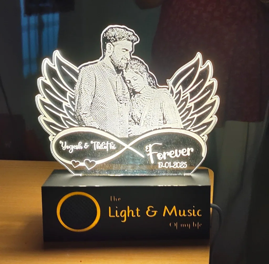 The design features your favorite couple’s photo engraved on high-quality acrylic, framed by gracefully spread wings that represent how love uplifts and empowers us. The infinity symbol beneath the wings stands for an eternal bond, while the warm LED light creates a soft, romantic glow that transforms any space into a haven of love.