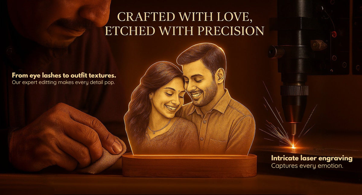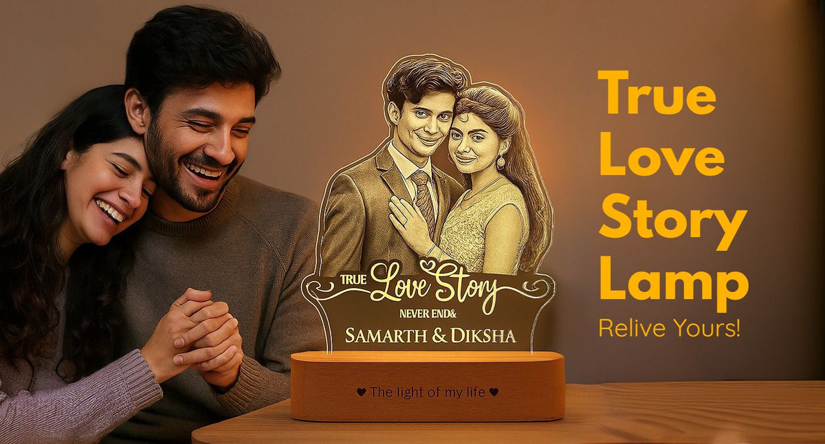 Each lamp features a high-quality transparent acrylic panel, finely engraved with a photo of the couple. Just below the image, the romantic phrase “A Love Story Never Ends” is etched into the design—making it a beautiful reminder that love is forever. To add a special touch, the couple's names are included, turning this into a one-of-a-kind gift they’ll treasure for years.