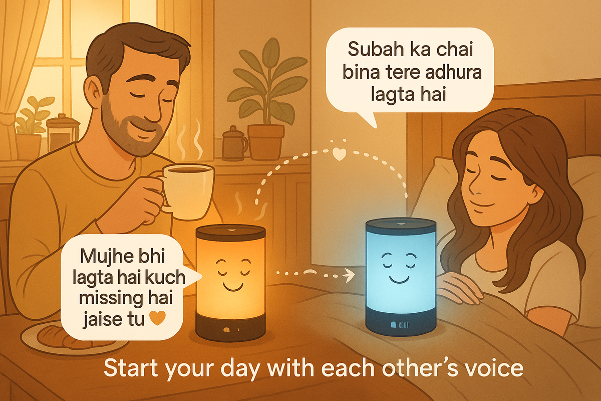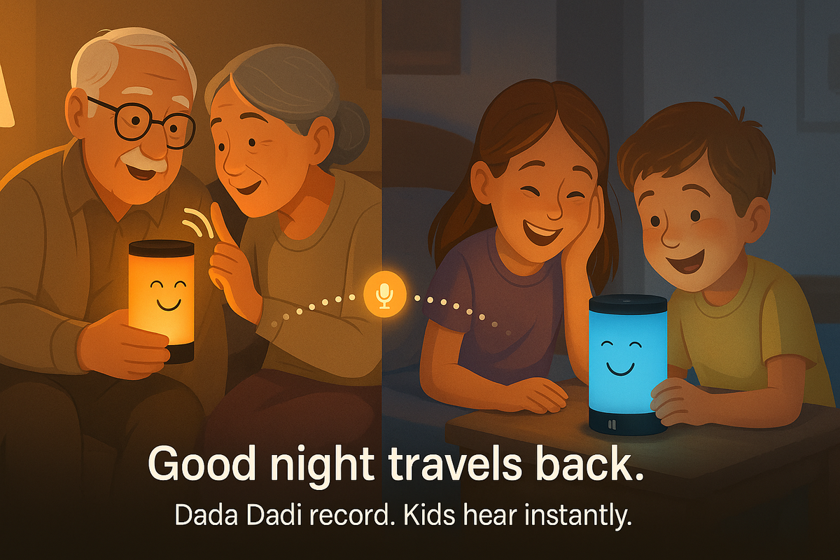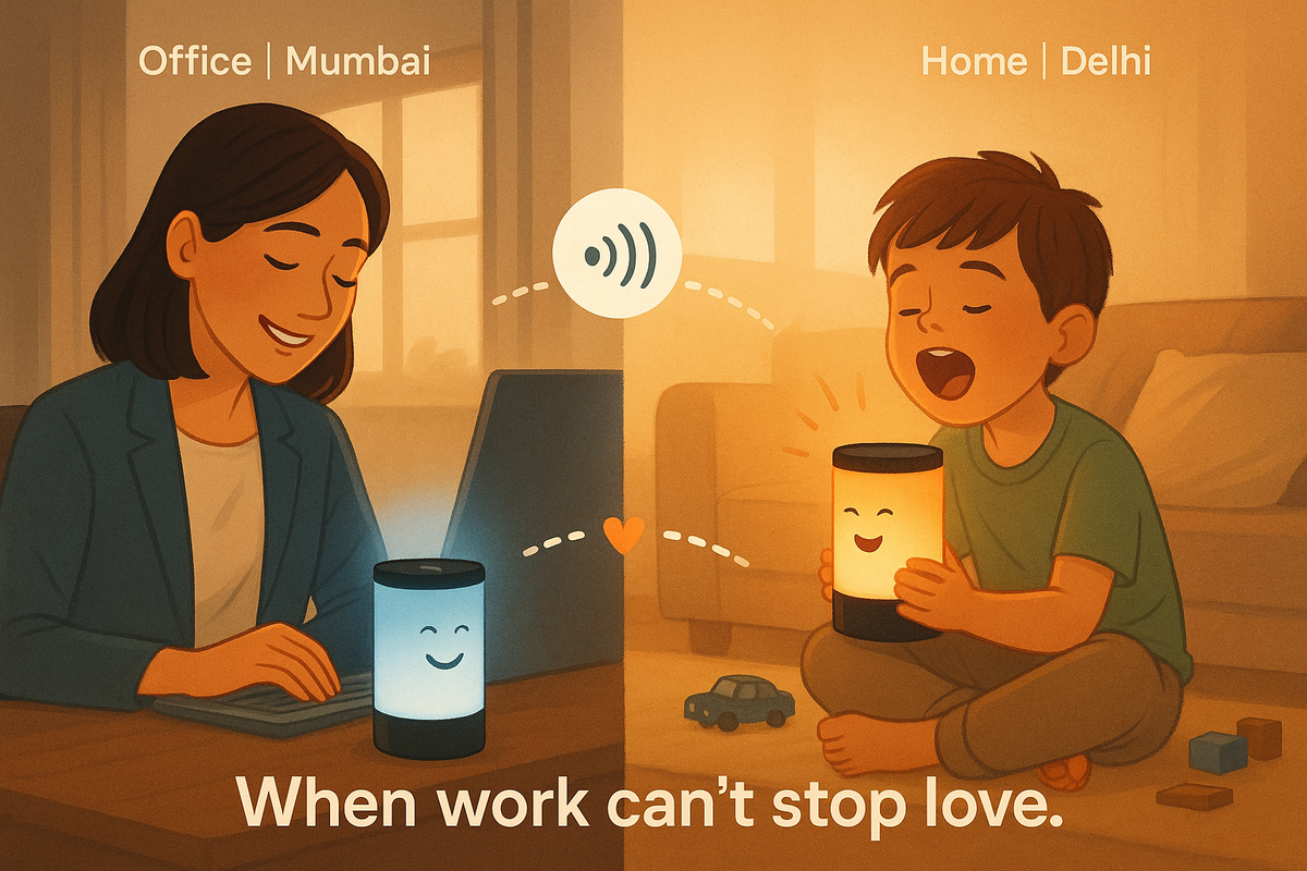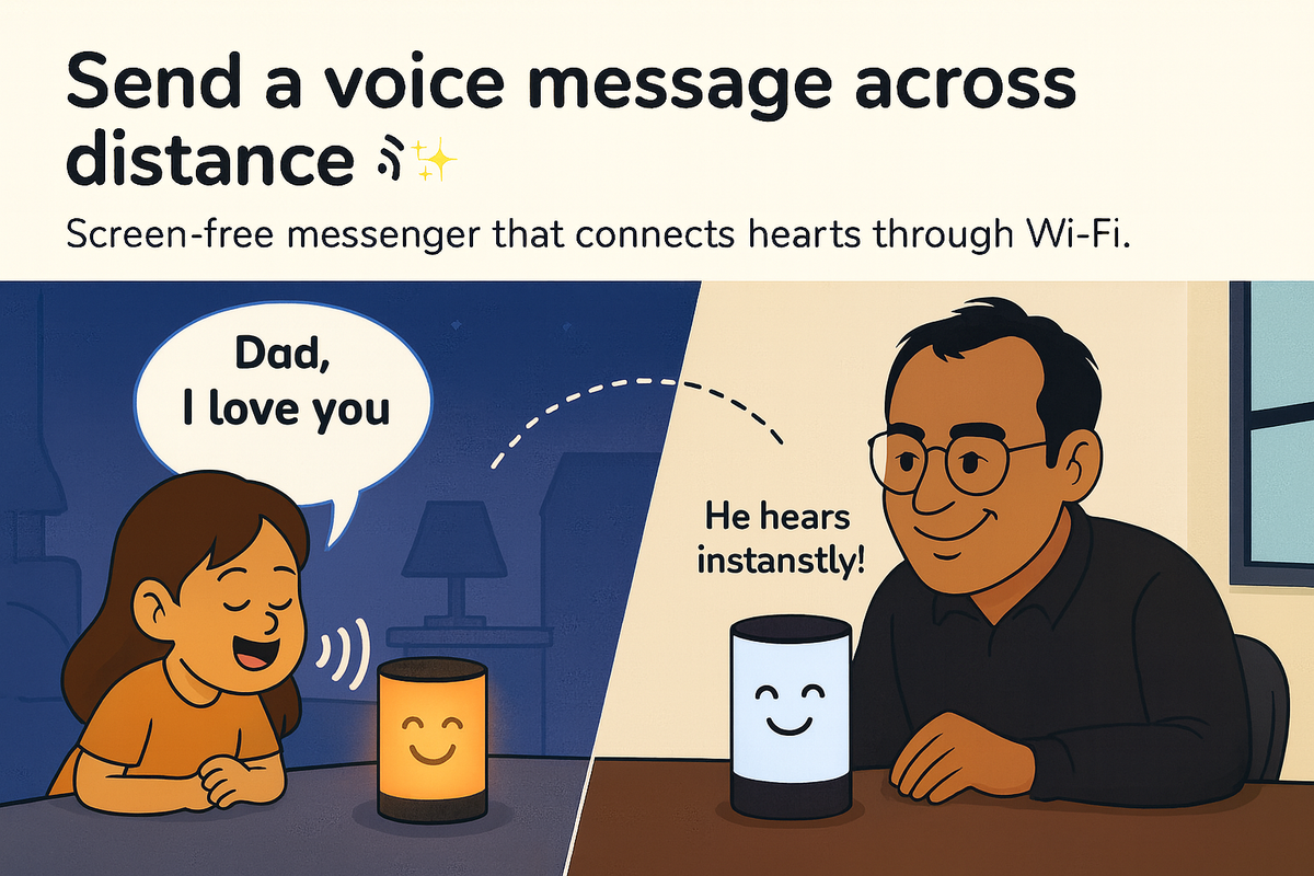 It’s a smart lamp that lets you send a voice message and a glowing color to someone you love — instantly. Just swirl to pick a color, tap to send. Or use the app to speak from miles away. Your voice and warmth travel with the light, straight into their space.